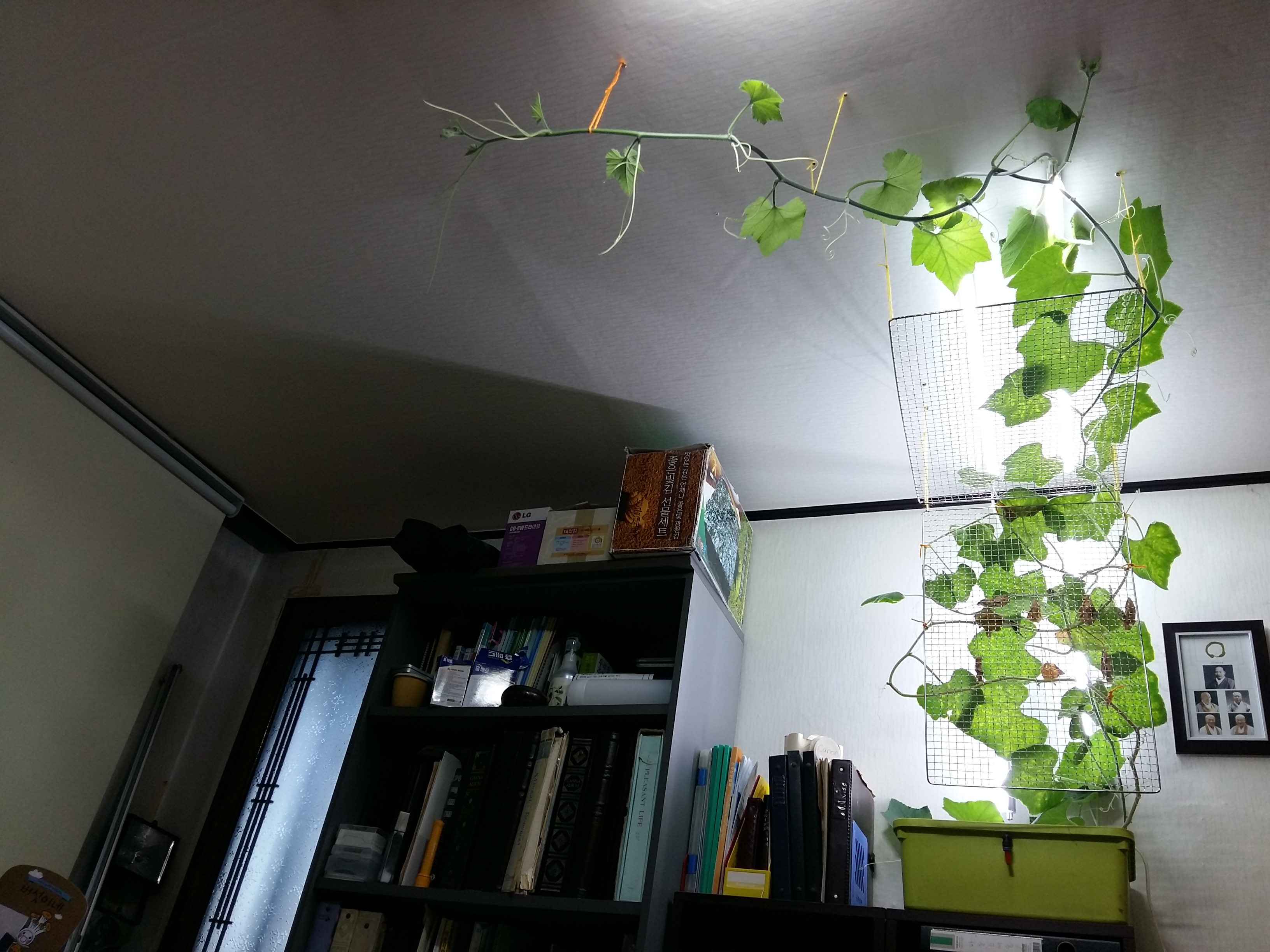 재배기로 옮긴 호박. 스탠드로 앞에서 빛을 비추고, 벽에는 T-5형 LED를 부착했다 (2016.07.04.)