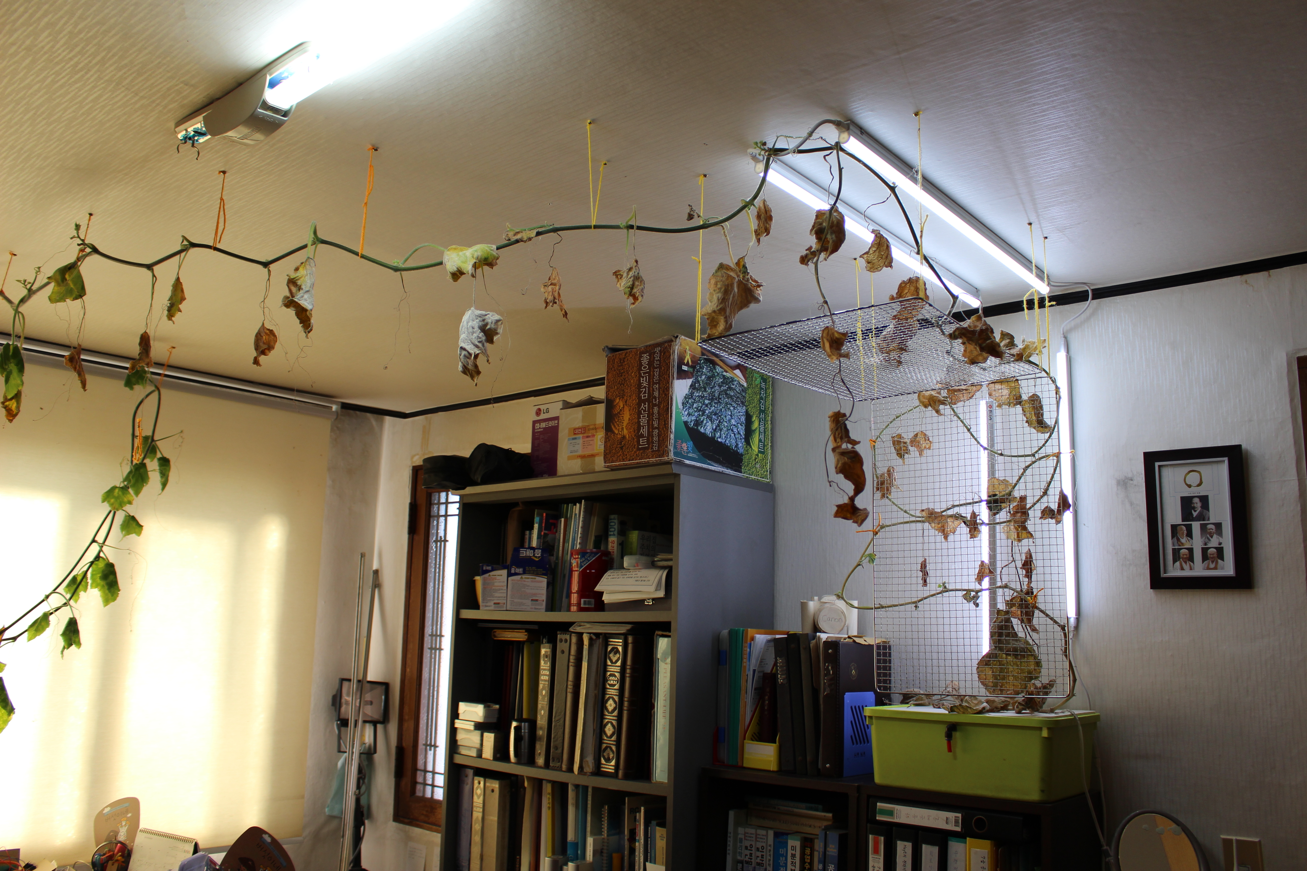 천장 전체를 텃밭처럼 이용하려면 제대로 된 구조물이 필요하다고 생각되었지만, 시험삼아 해 보는 것이라서 일부만 구조물을 설치했다. 구조물로는 고기를 구워먹는 데에 쓰는 석쇠를 이용했다.