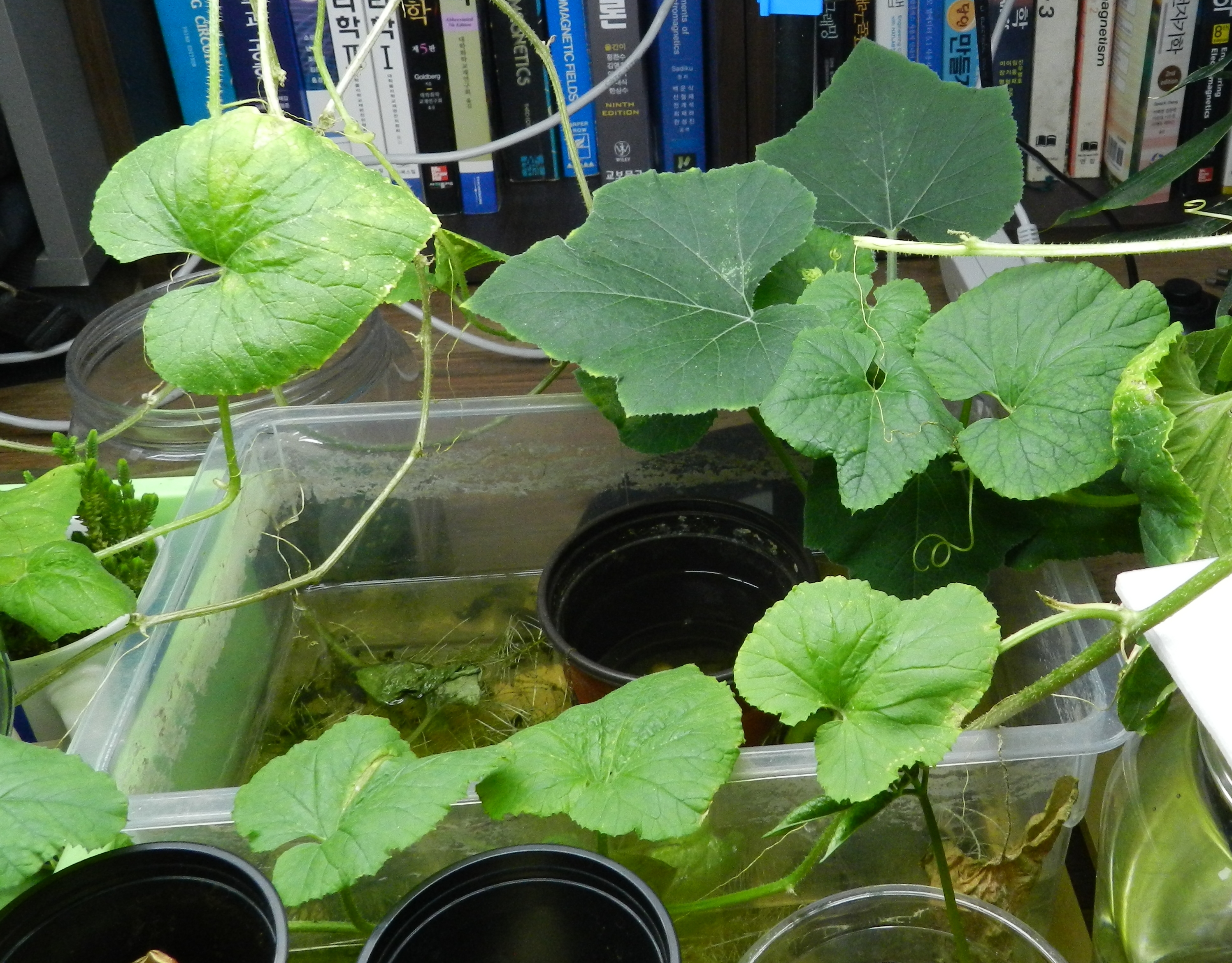 수경재배방식은 비순환식 담액방식(DWC; Deep Water Culture)를 사용했다. 재배용기는 락앤락의 INPLUS 15L 수납함을 사용했다. 재배용기의 덮개는 두께 5mm 포맥스판에 구멍을 뚫은 것을 사용했다. 다른 용도로 가공의뢰하여 만들었던 것이다. 에어펌프로 공기를 불어 넣었다. 양액농도는 약 500ppm으로 맞추었다. 호박에 적합한 양액농도가 있지만 하나의 양액으로 여러 식물을 키우고 있고, 덮개가 없어 수분이 증발하면서 양액농도가 높아지는 구조로 키우는 다른 식물들이 있어 좀 묽은 상태로 맞추어 모든 식물에 공급하고 있다.