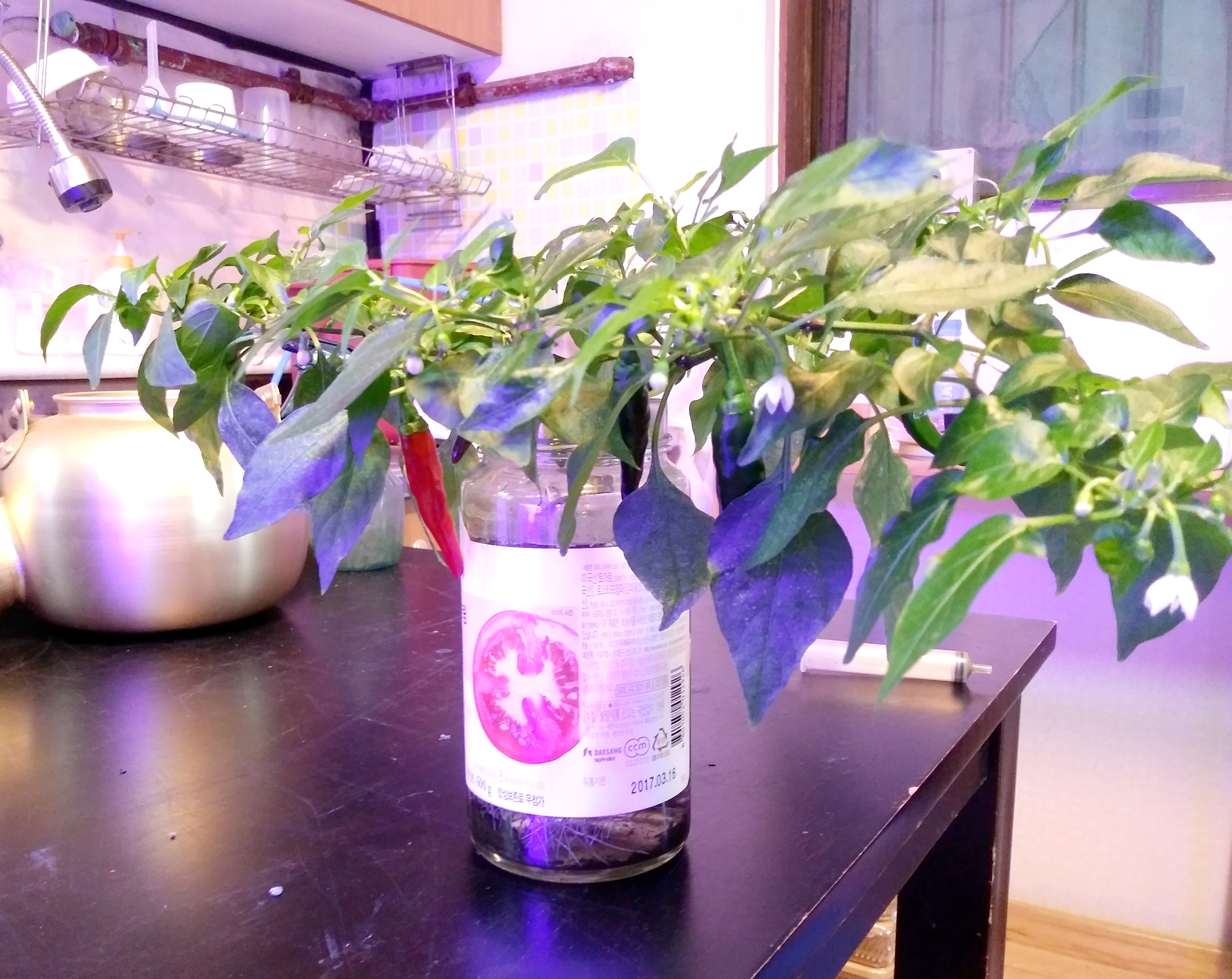 이제 11월이 되었습니다. 노지에서 키우는 고추는 이미 수확이 끝났을 시기입니다. 꺾꽂이한 고추는 계속 꽃을 피우면서 열매를 맺고 있습니다. 자라는 모습에서 특이한 점은 키는 별로 크지 않고 옆으로 퍼져나간다는 점입니다. 이 특징은 수경재배로 키울 때 유리한 점이라 할 수 있습니다. 수경재배기에서 높이를 조절하는 것은 어려워도 옆 공간을 넓히는 것은 식물을 이동하는 것만으로 간단히 할 수 있기 때문입니다. 이놈만의 특징인지 이렇게 키우면 다 그렇게 되는 것인지는 여러 그루 키우면서 확인할 필요가 있습니다.
