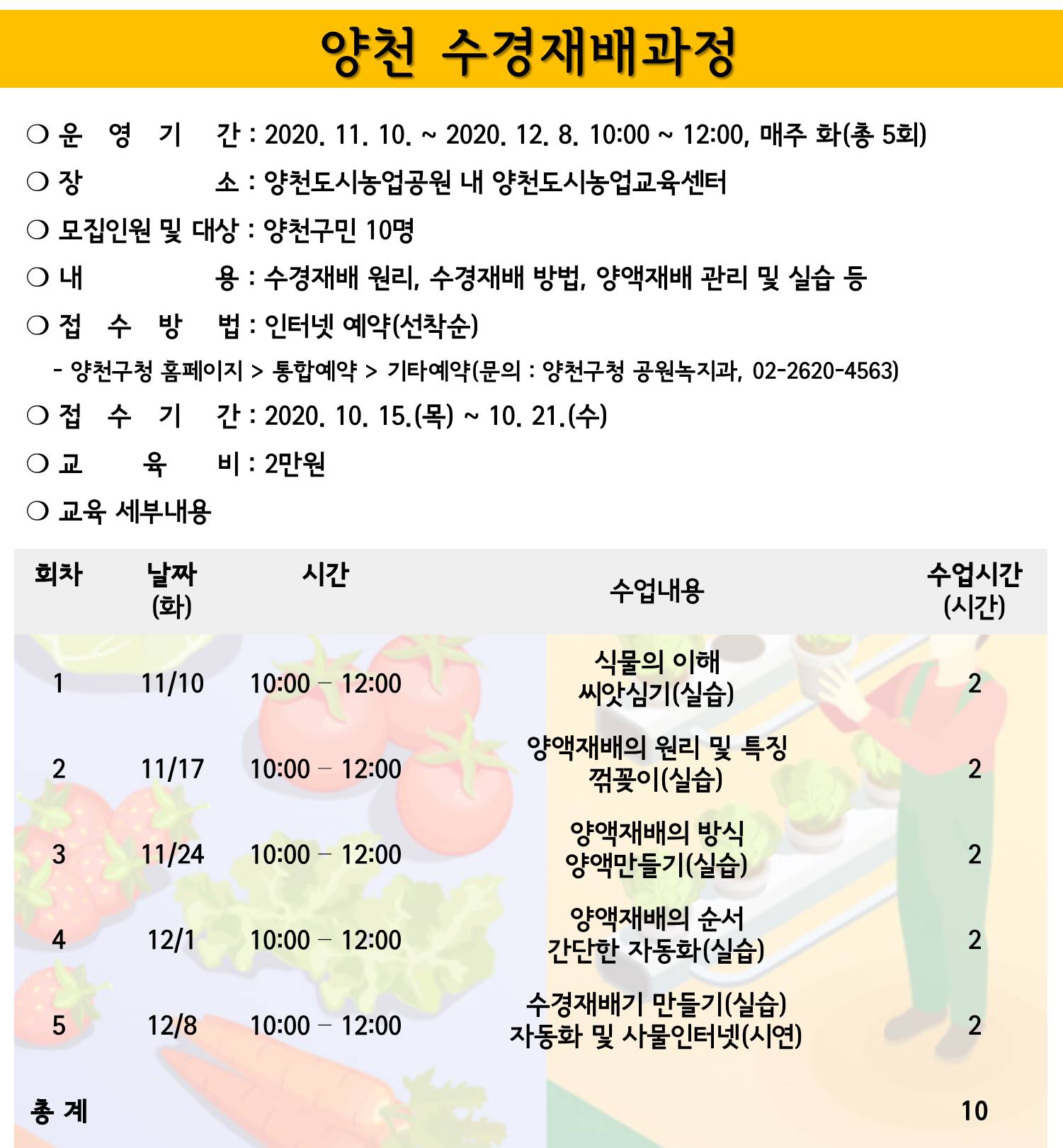 2020년 7월에 양천구청 공원녹지과 도시농업 담당자로부터 연락을 받고 강의를 하기로 했습니다. 보통은 수경재배 기초과정으로 2시간 강의를 4회 하는데, 요청에 따라 5회에 맞게 구성하였습니다. 5회째에 하는 수경재배기 만들기는 수강생의 의견을 들어 결정하기로 했습니다. 자세한 강의계획은 첨부합니다.