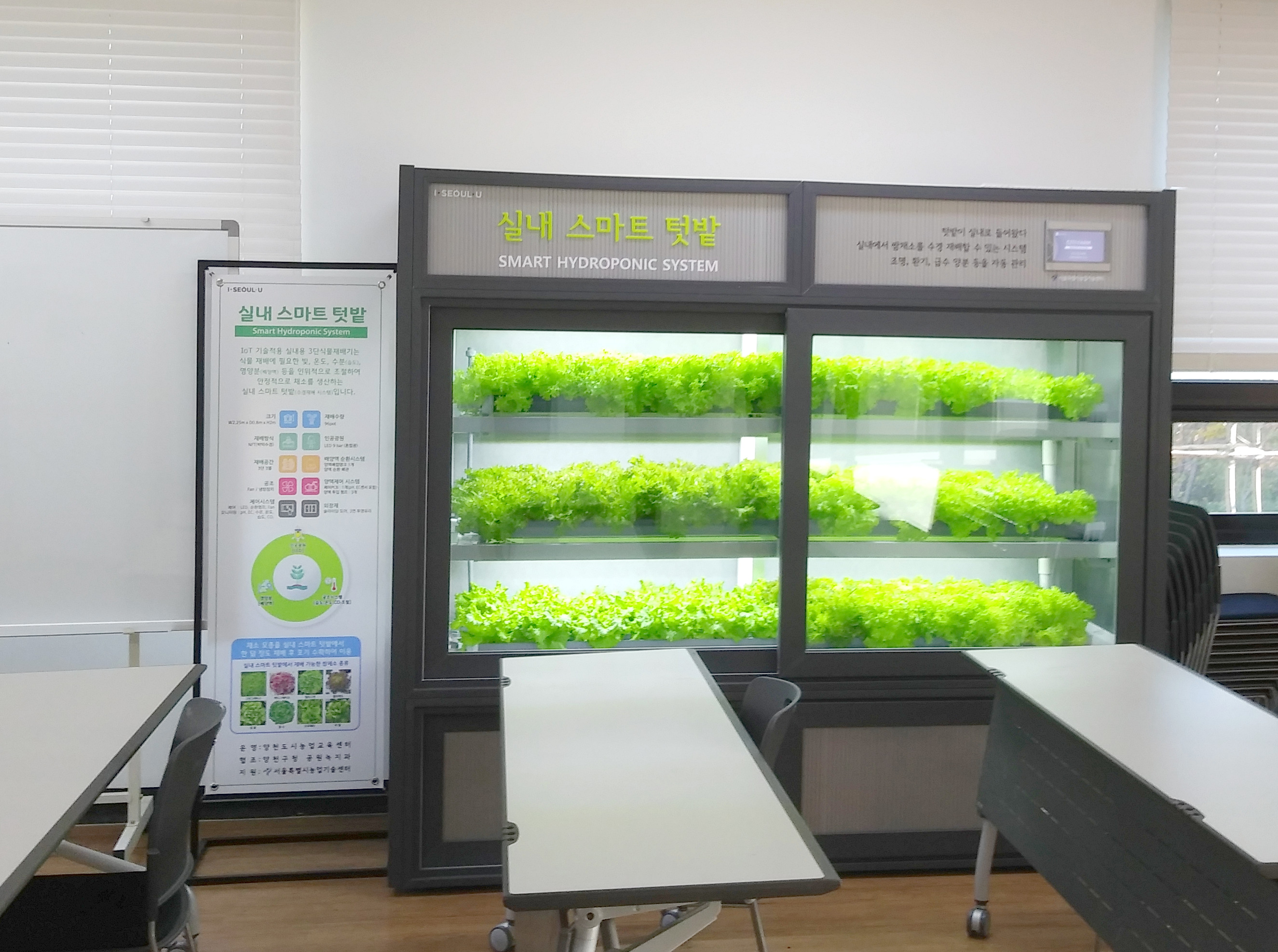강의실에는 실내 스마트 텃밭이 설치되어 있었습니다. 살펴보니 사각관을 이용한 DFT(Deep Flow Technique) 방식의 양액재배를 적용했습니다. 물과 농축양액을 섞어서 적절한 농도의 양액을 만드는 일은 자동으로 하게 되어 있습니다. 농축양액은 관리하는 회사가 공급하고, 물은 사람이 부어주는 방식으로 공급합니다. 원래는 수도관에 연결하여 믈도 자동으로 공급되는 방식이라고 하는데, 강의실에 수도가 설치되어 있지 않아 사람이 부어주는 방식으로 바꾸었다고 합니다.