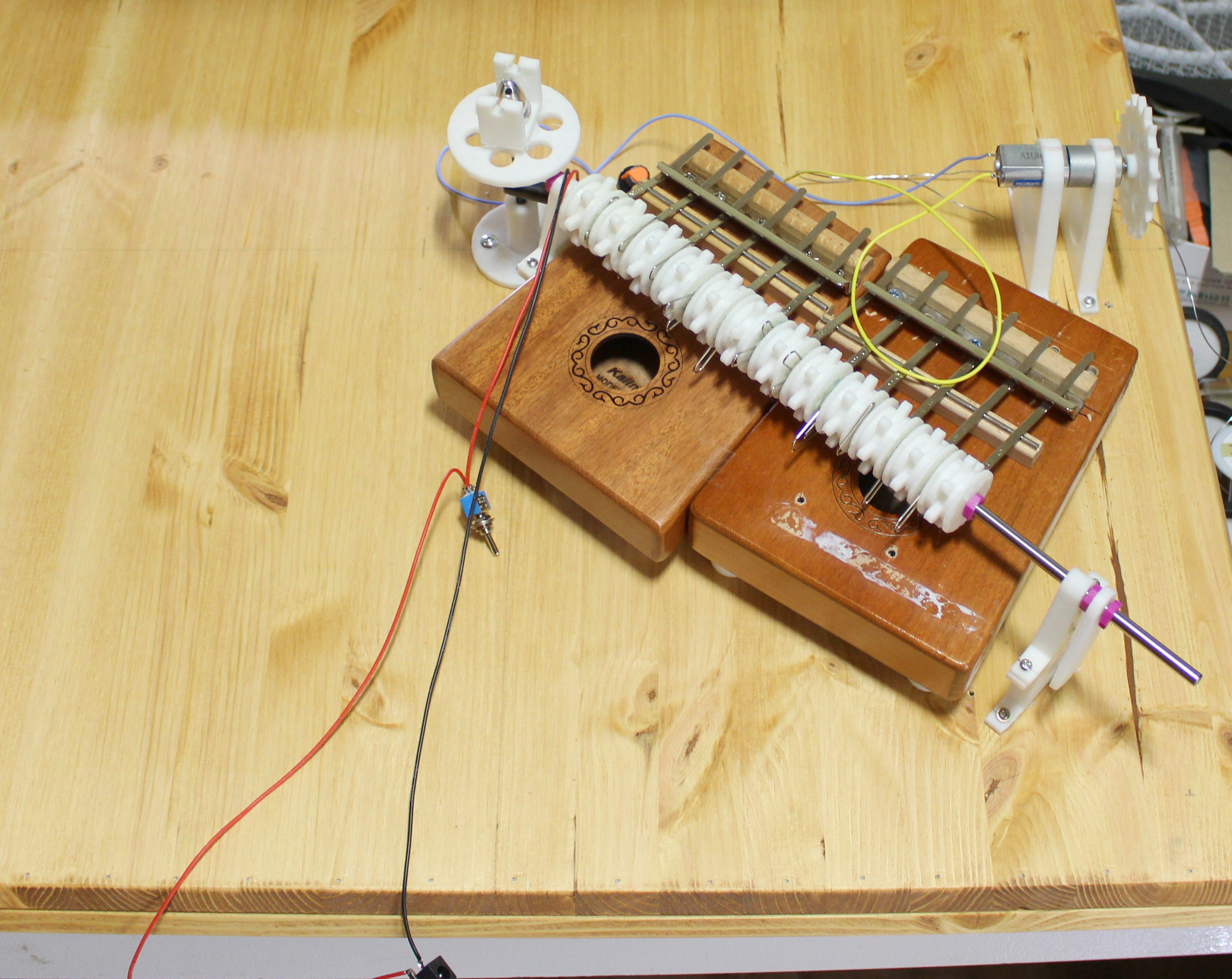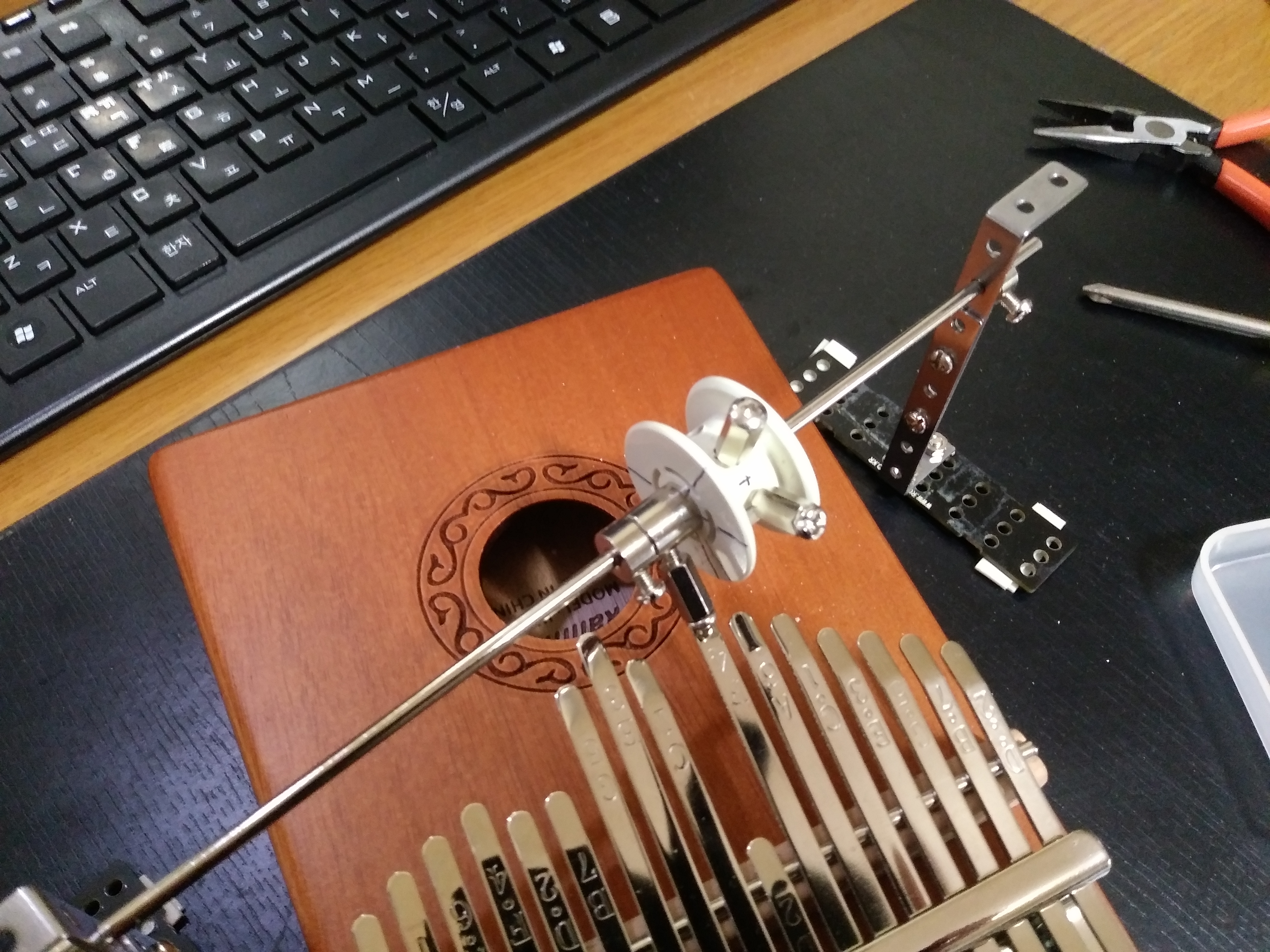 위의 문제를 해결하기 위해 서보모터의 암(arm)에 선형 솔레노이드 액추에이터를 달았습니다. 암이 내려갈 때는 액추에이터의 플러저(plunger)가 나와 칼림바 타인을 누르게 하고, 암이 올라갈 때는 플런저를 넣어 타인에 걸리지 않고 올라가도록 했습니다.