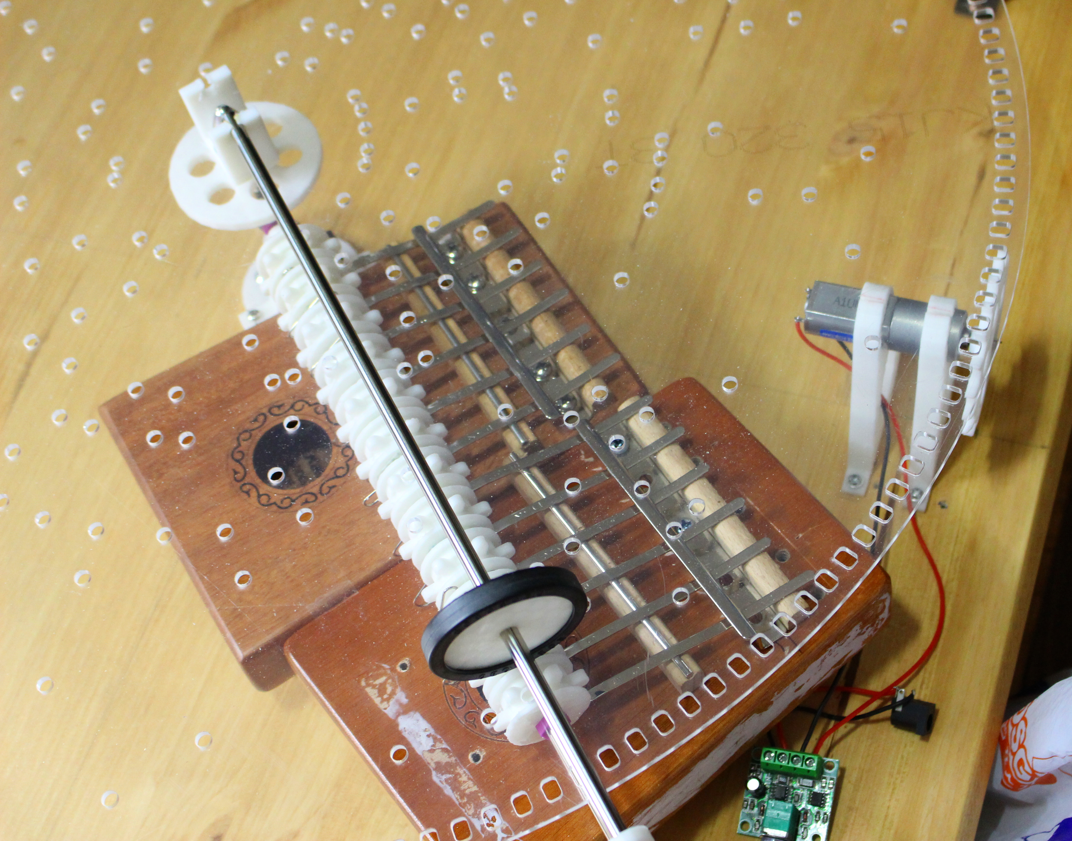 원판의 구멍이 뚫린 곳이 지나가면 트리거 롤러가 걸려서 소리가 나야 하지만 위 동영상에서 보듯이 어떤 것은 소리가 나고 어떤 것은 안 났습니다. 원판을 누르면 휘어질 수 있으면 이 문제가 개선될 수 있지만 아크릴로 만든 원판의 두께가 5mm인 것을 사용하기로 했고, 거기다가 원판이 조금 휘어 있었습니다. 이렇게 휜 원판을 위 사진에서처럼 봉과 휠로 누르는 것은 별 효과가 없었습니다. 휘어있는 두꺼운 아크릴판을 펼 정도의 힘이라면 다른 부품이 부서질 것이 확실하기 때문에 하지 않기로 했습니다. 이 문제의 확실한 해결책은 평평하거나 휘는 원판을 사용하고, 구멍에 돌출부를 만드는 것이었으나 전시기간이 얼마남지 않아 하지 않기로 했습니다. 그래서 원판으로 소리내는 것은 포기하고 다른 오디오 기기로 소리를 들려주기로 했습니다.