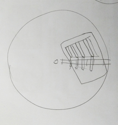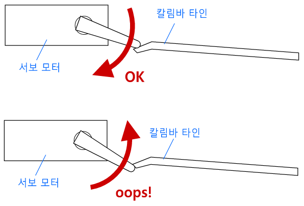 서보모터로 칼림바의 소리를 내는 것이 핵심적인 기술이었기 때문에 이것부터 실험을 해 보았습니다. 처음으로 부딪힌 문제는 서보모터가 왕복회전을 하는 것이었습니다. 서보모터에 막대 같은 것을 부착하여 칼림바의 타인을 눌러서 소리를 냈다고 했을 때, 이후 다시 원판의 구멍을 만나 소리를 내기 위해서는 막대가 처음 자리로 가 있어야 합니다. 그런데 서보모터는 일정한 각도 내에서 왕복하기 때문에 처음의 자리로 되돌아가기 위해서는 타인을 누르면서 움직인 경로를 거슬러 올라가야 합니다. 이 과정에서 타인에 다시 닿게 됩니다. 타인은 아래로 구부러져 있어 위에서 누르면 미끄러지면서 소리를 내게 되는데 아래에서 올리면 걸리게 됩니다. (아래 그림)