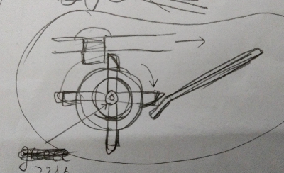 2. 휠은 회전판의 돌출부에 걸려 힘을 받아 타인의 탄성력을 이기고 누르게 된다. 타인을 튕기고 나서는 빠른 속력으로 시계방향으로 회전하게 된다. 그러면 원판의 돌출부에 걸려있던 휠의 돌출부가 타인을 다시 치게 될 수 있다. 이것은 휠의 반지름, 휠 돌출부 사이의 거리, 타인의 위치 등에 의해 결정되므로 정확한 치수로 검토해 보아야 알 수 있다.