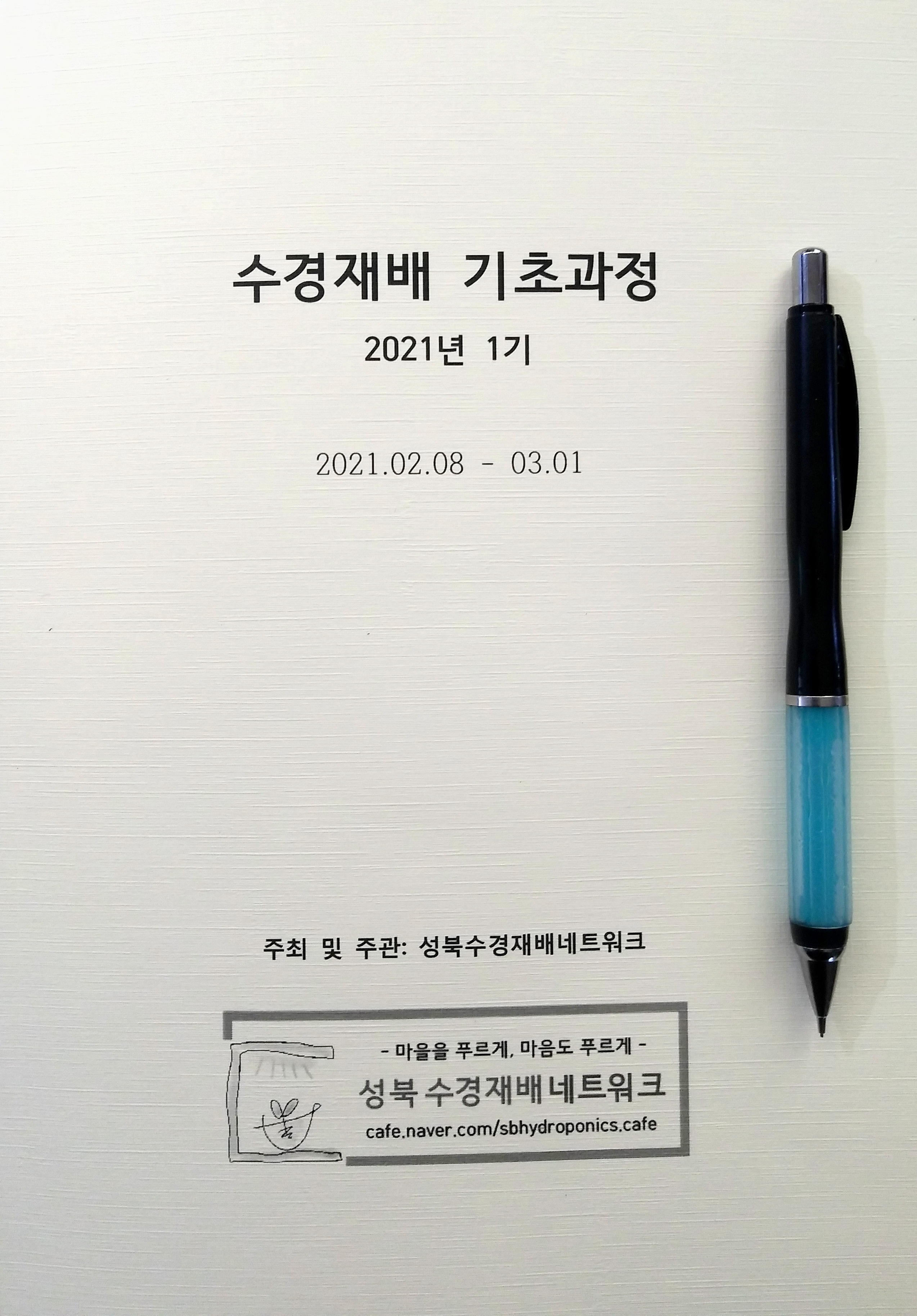 안녕하세요? 성수네가 주최하고 주관한 수경재배 기초과정 2021년 1기 내용이 정리되어 공유합니다. 코로나-19로 인해 비대면으로 진행했던 강좌였습니다. 자세한 내용은 링크합니다.