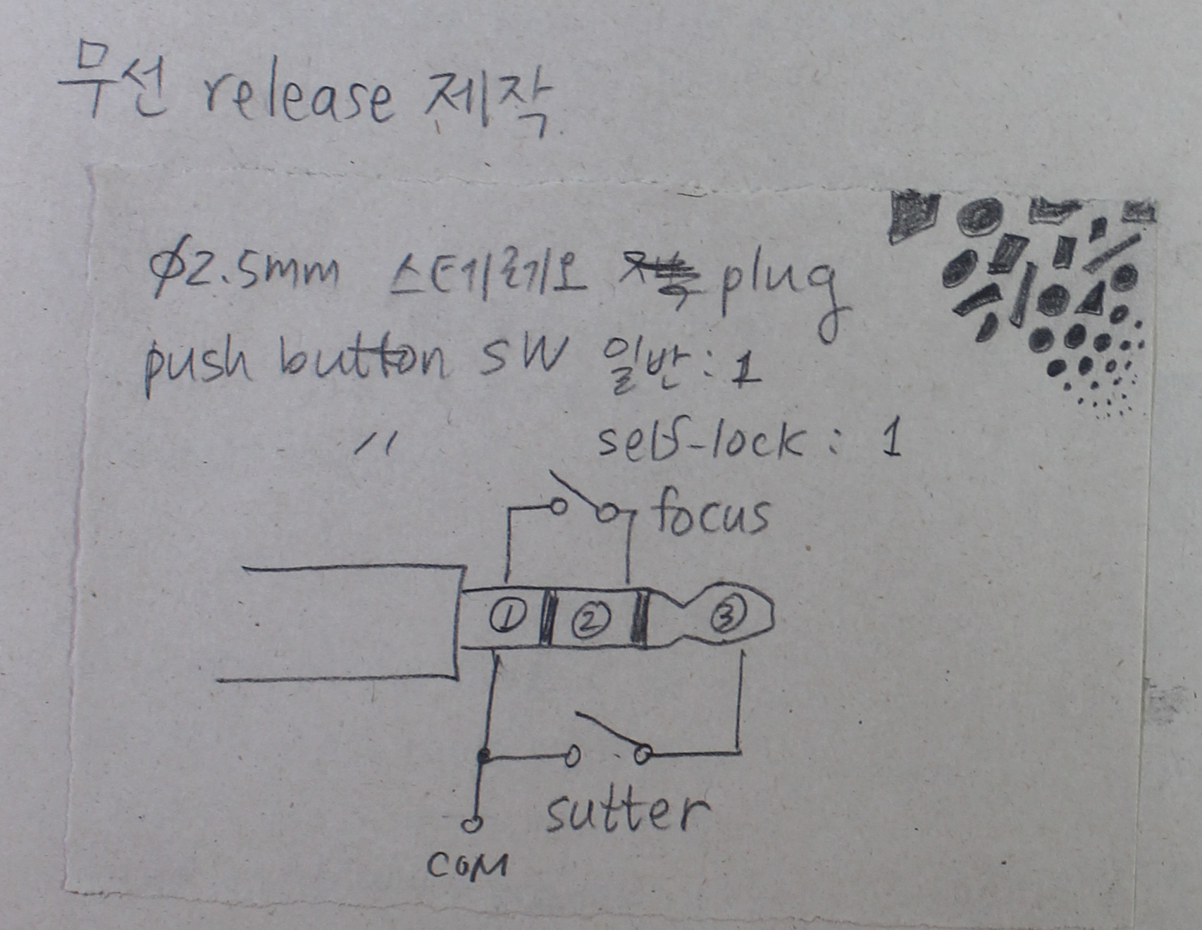 유선 방식으로 리모트 스위치를 꽂아 반누름으로 포커스를 잡고 완전히 눌러 셔터를 열고 놓아서 셔터를 닫을 수 있습니다. 카메라 용어로는 '케이블 릴리즈(cable release)'라고 합니다. 그러기 위해서는 리모트 스위치를 계속 들고 있어야 하는데, 왼손으로 적외선 수신기를 흔들고 오른손으로 포커스와 셔터를 동작하는 것을 함께 하는 것이 잘 되지 않을 것 같아 무선으로 동작하는 릴리즈를 만들기로 했습니다.