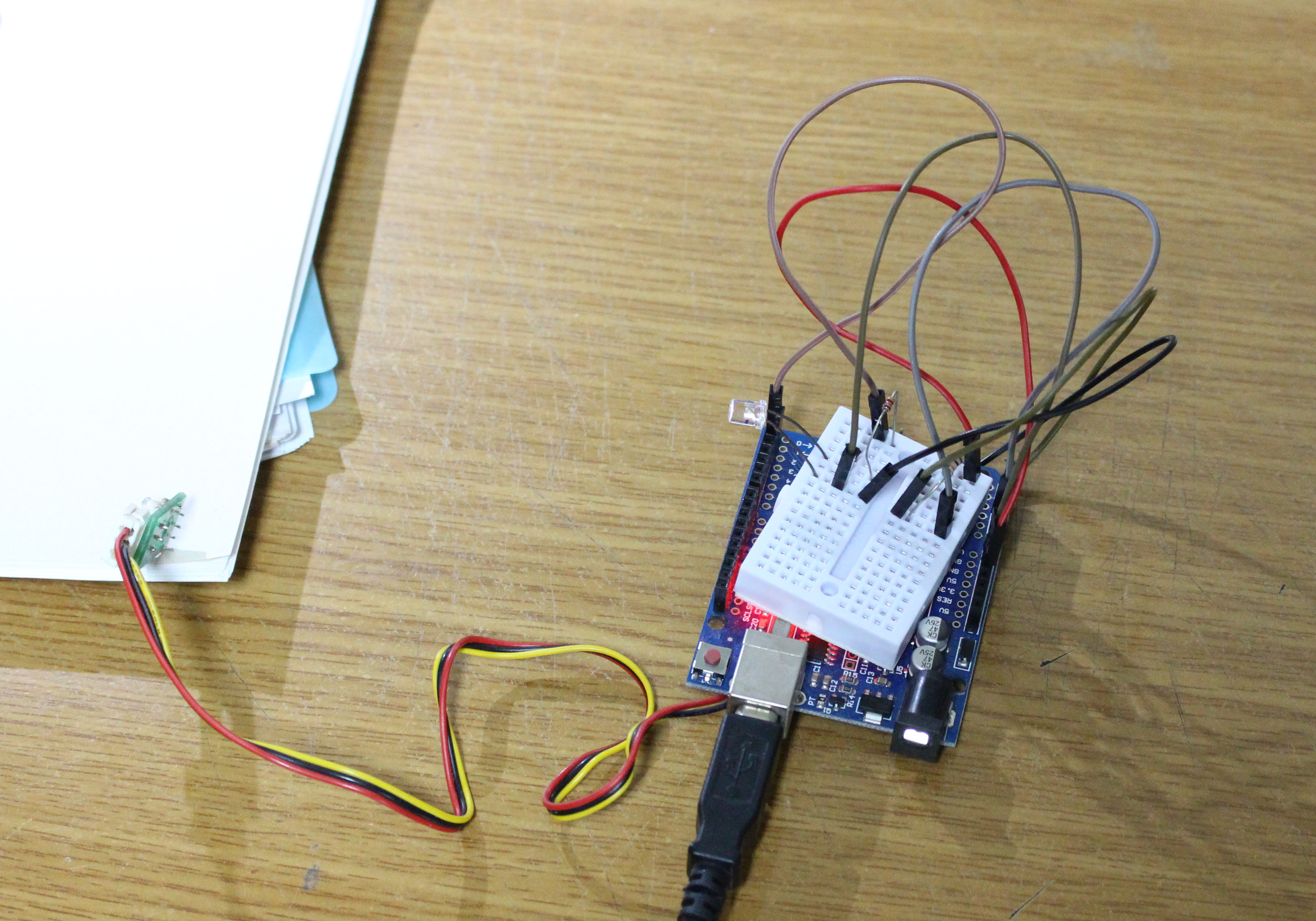 수신부의 신호를 측정해 보니 적외선을 받으면 -0.2V, 받지 않으면 2.3V 정도 나왔습니다. 아날로그 값이라서 아두이노 아날로그 입력단자에 연결했습니다. 아날로그 입력으로 전압을 인가하면 0~5V의 전압에 따라 0~1023의 값으로 변환하게 됩니다. 몇 번 실험을 하여 1000의 값을 기준으로 하여 1000이상이면 적외선이 없다고 간주하여 LED에 LOW값을 출력하고, 입력값이 1000미만이면 적외선이 있다고 간주하여 LED에 HIGH값을 출력하게 했습니다. 프로그램 올립니다.