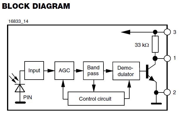 자료를 보니 적외선 수신모듈은 단순한 포토 다이오드나 포토 트랜지스터가 아니라 여러 가지 회로가 들어가 있는 IC라는 것을 알게 되었습니다. AGC(automatic gain controll; 자동이득조절)가 있고, band pass filter(대역통과여파기)도 있고, demodulator(복조기)도 있습니다. 이러한 복잡한 기능을 가지고 있으니 적외선 통신에 사용하는 신호가 아니면 제대로 처리를 못하는 것 같습니다.