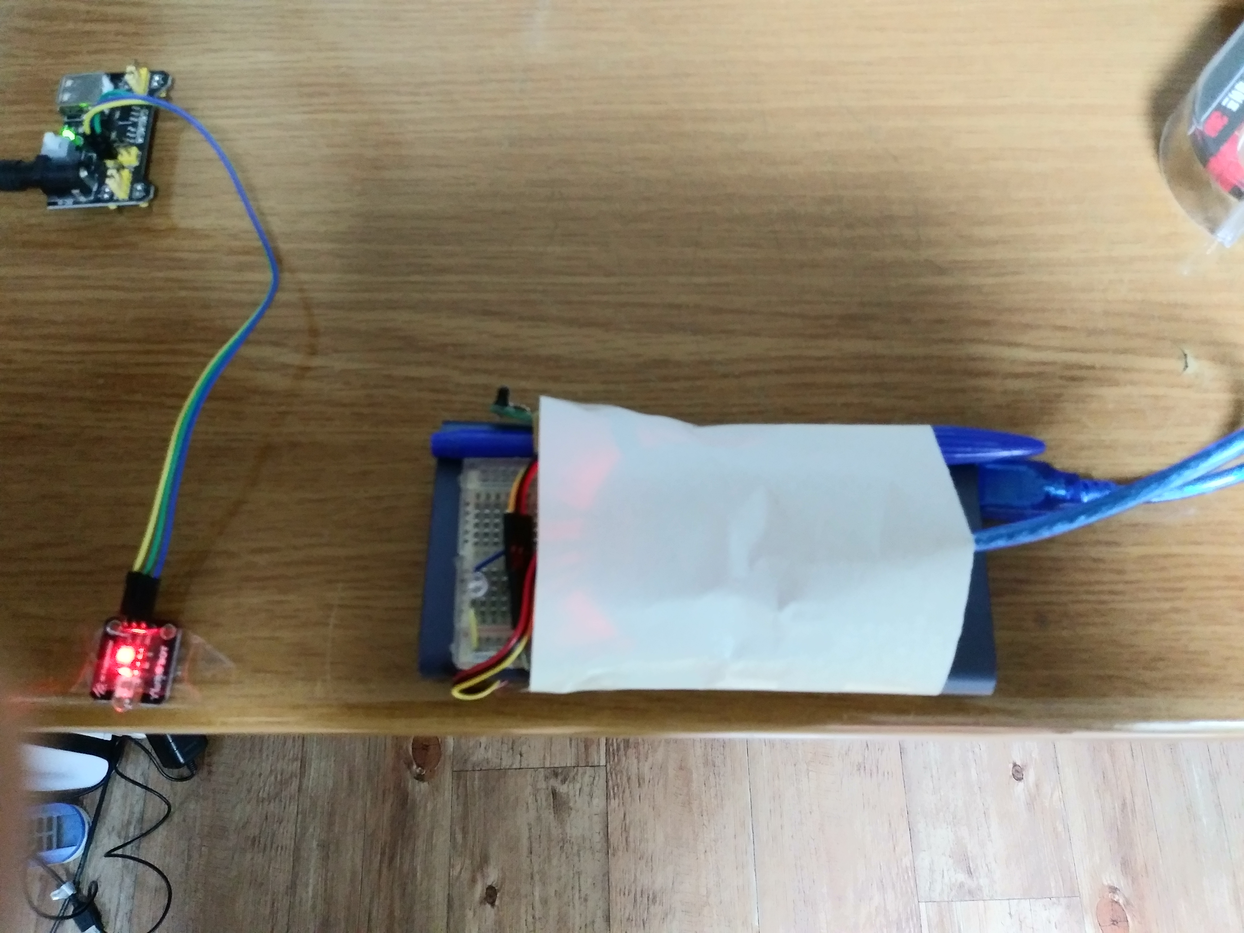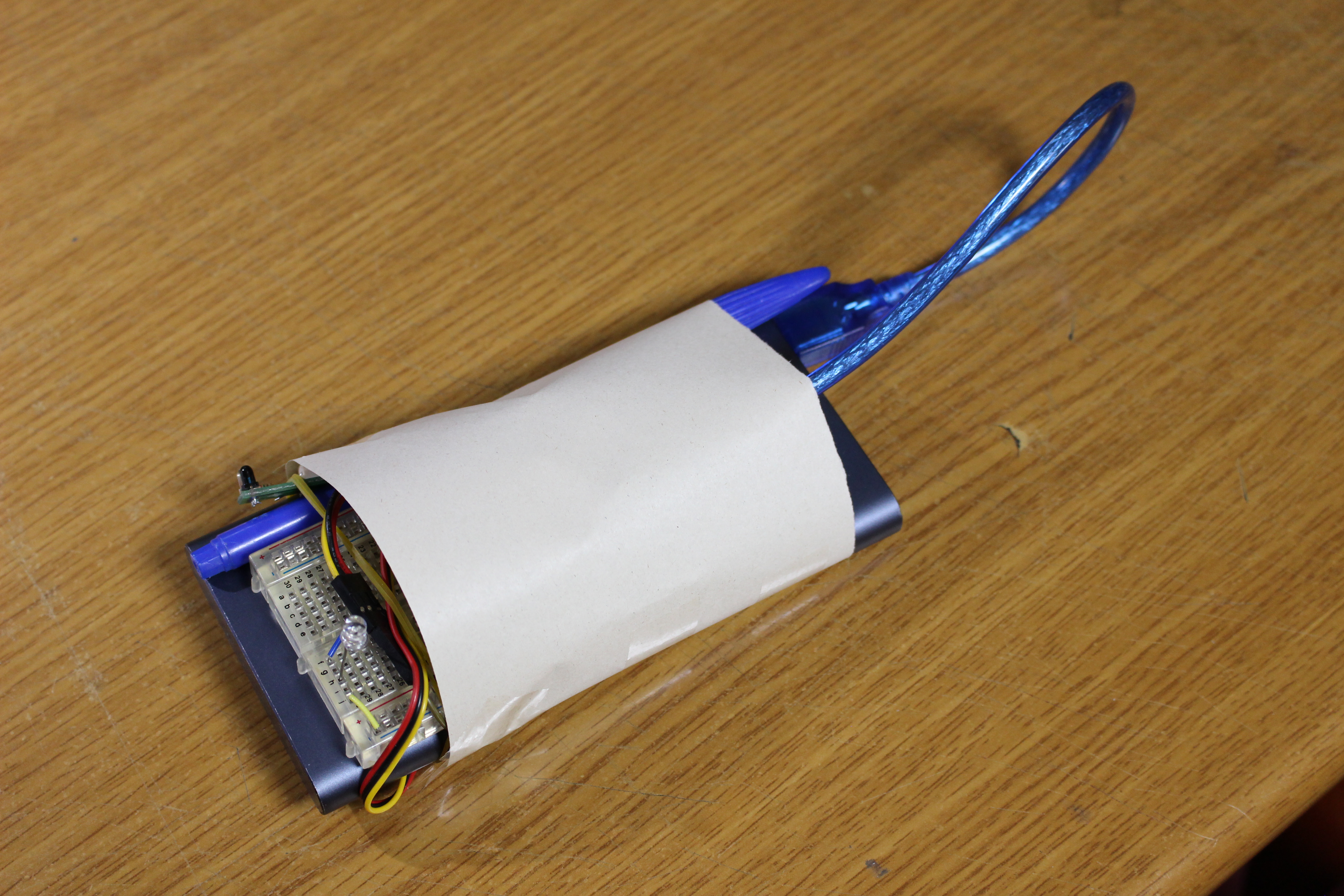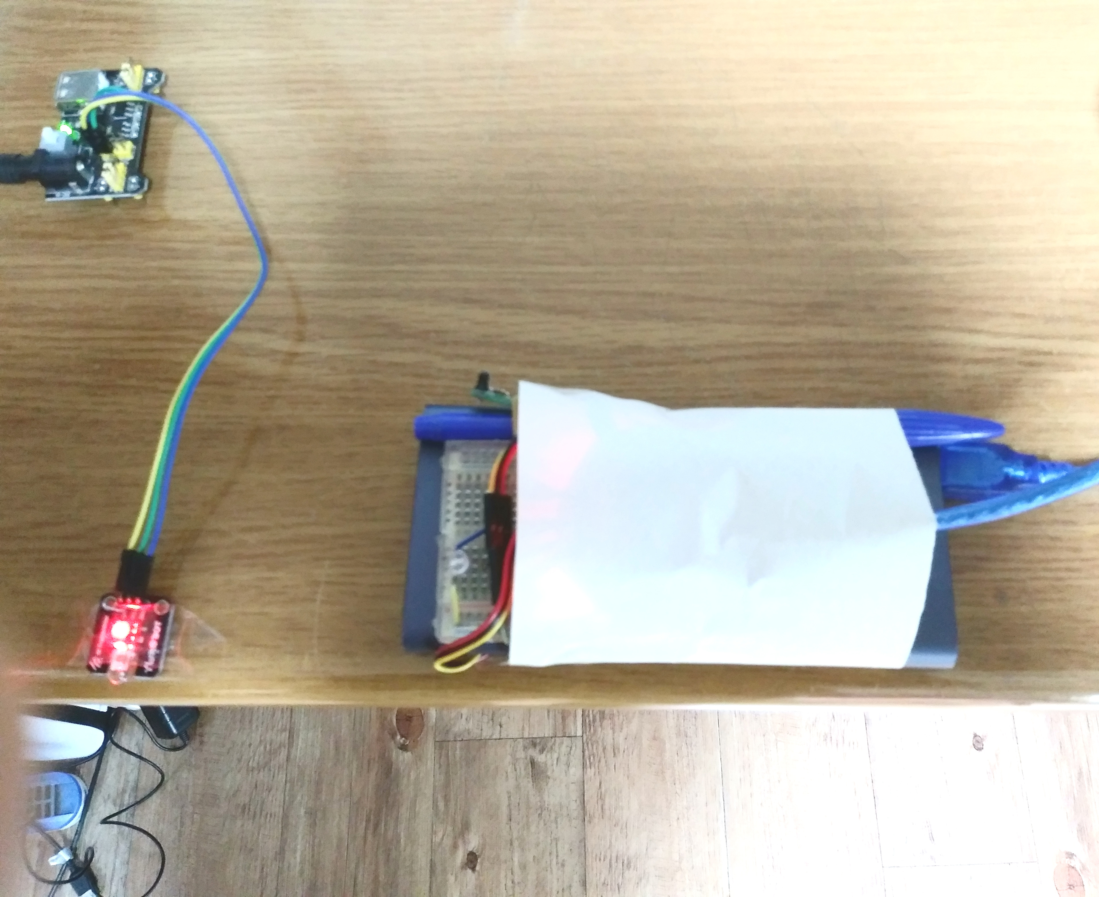 수신부의 브레드보드와 배터리를 뭉쳤습니다. 아두이노 기판의 LED 빛이 나오지 않도록 종이로 막았습니다. 적외선 수신용 포토다이오드는 LED와 직각을 이루도록 배치했습니다. 저대로 들고 좌우로 흔들면 되도록 했습니다.