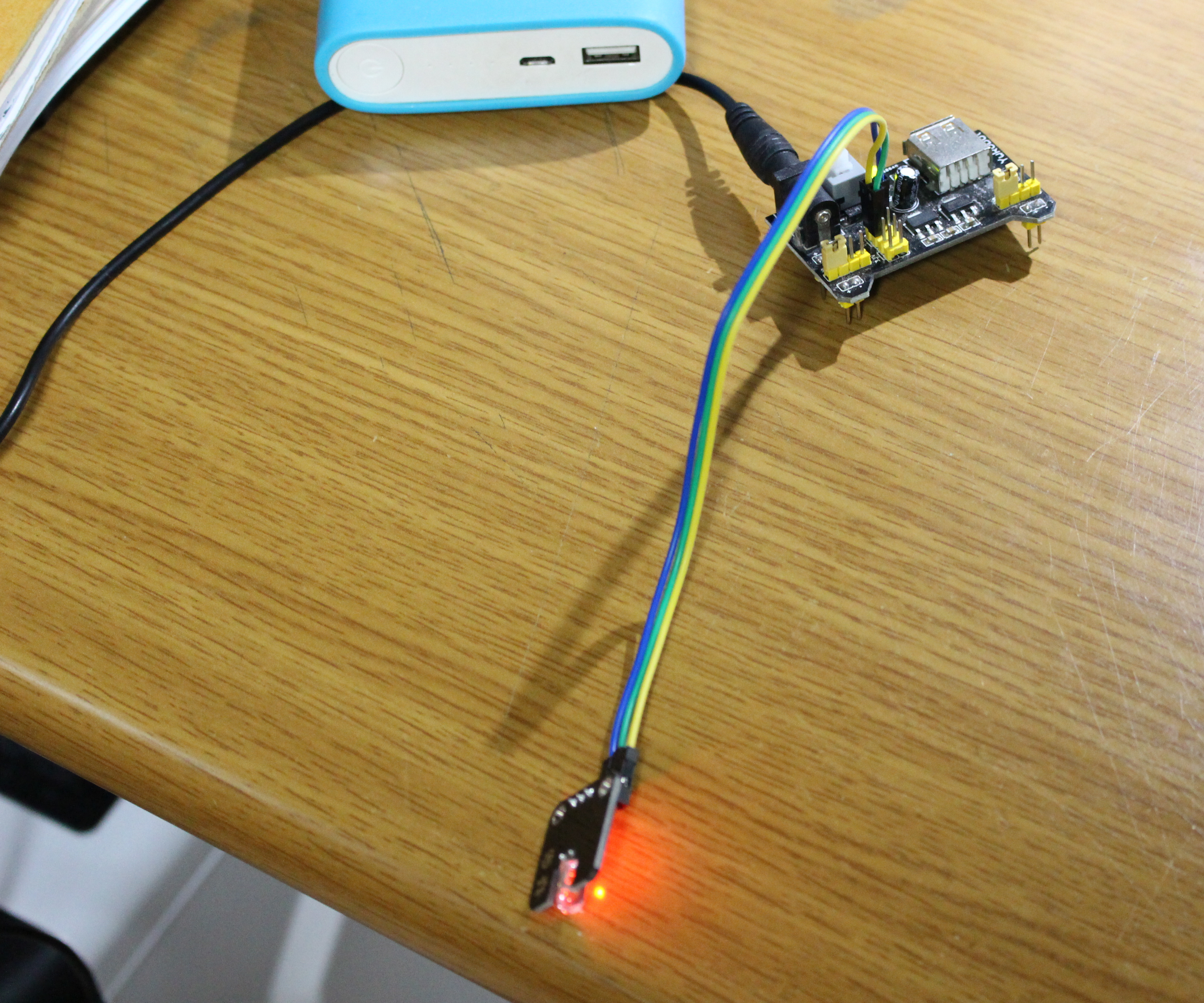 송신부는 적외선 LED에 단순히 전원만 연결했습니다. 아무 신호 없이 계속 켜져있게 됩니다. 사진의 윗쪽 회로기판은 5V 이상의 전압을 받아서 3.3V나 5V의 전압을 내어주는 회로입니다. 5V에 맞추어 사용했습니다.