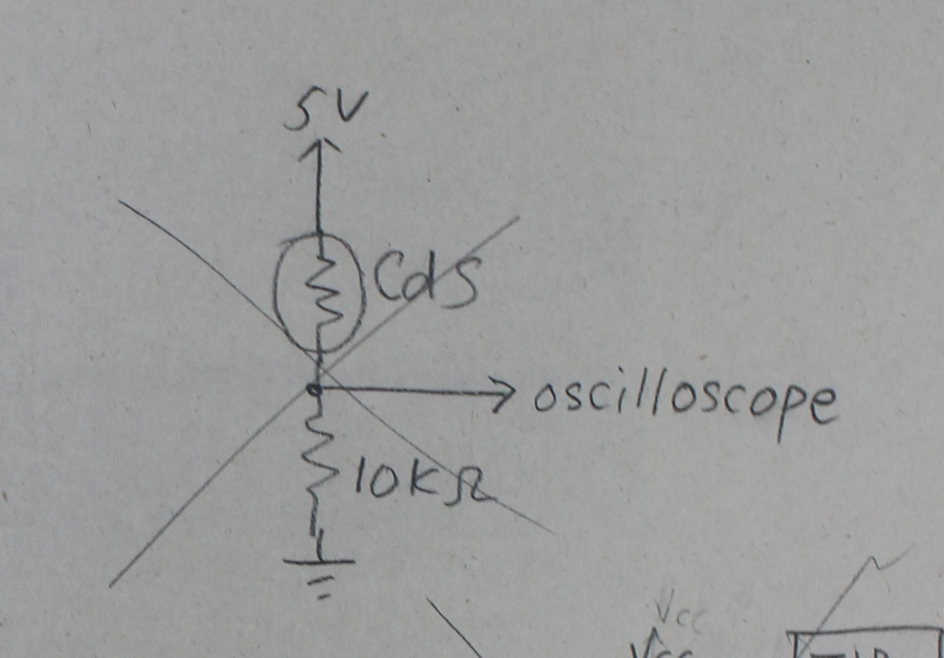 CdS에 10kohm 저항을 직렬로 연결하고, 오실로스코프에 연결하여 빛의 변화에 따른 전압의 변화를 확인했습니다.