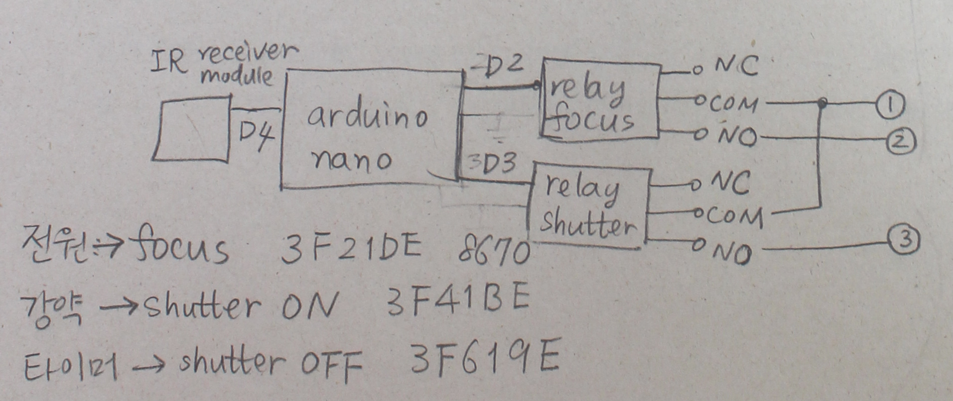 리모콘으로부터 신호를 받아 플러그의 스위치를 작동시키는 블록다이어그램입니다. 리모콘으로 신호를 받아보니 포커스를 동작시키는 스위치를 누르면 0x3F21DE가 나왔고, 셔터 ON 스위치를 누르면 0x3F41BE, 셔터 OFF 스위치를 누르면 0x3F619E 신호가 나왔습니다. 리모콘의 신호를 받아서 알려주는 프로그램은 앞에서 사용한 IRreceiver_test_2022-01-10.ino를 사용했습니다.