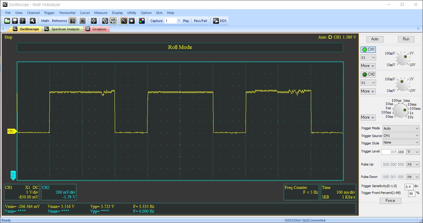 송신하는 적외선 LED에 구형파(square wave)를 넣고 포토 다이오드 양단의 전압을 측정해 보았습니다. 0V~3.7V의 범위가 나오므로 아두이노의 입력으로 넣을 만큼 진폭이 됩니다. 아래는 구형파를 만드는 스케치 프로그램입니다.