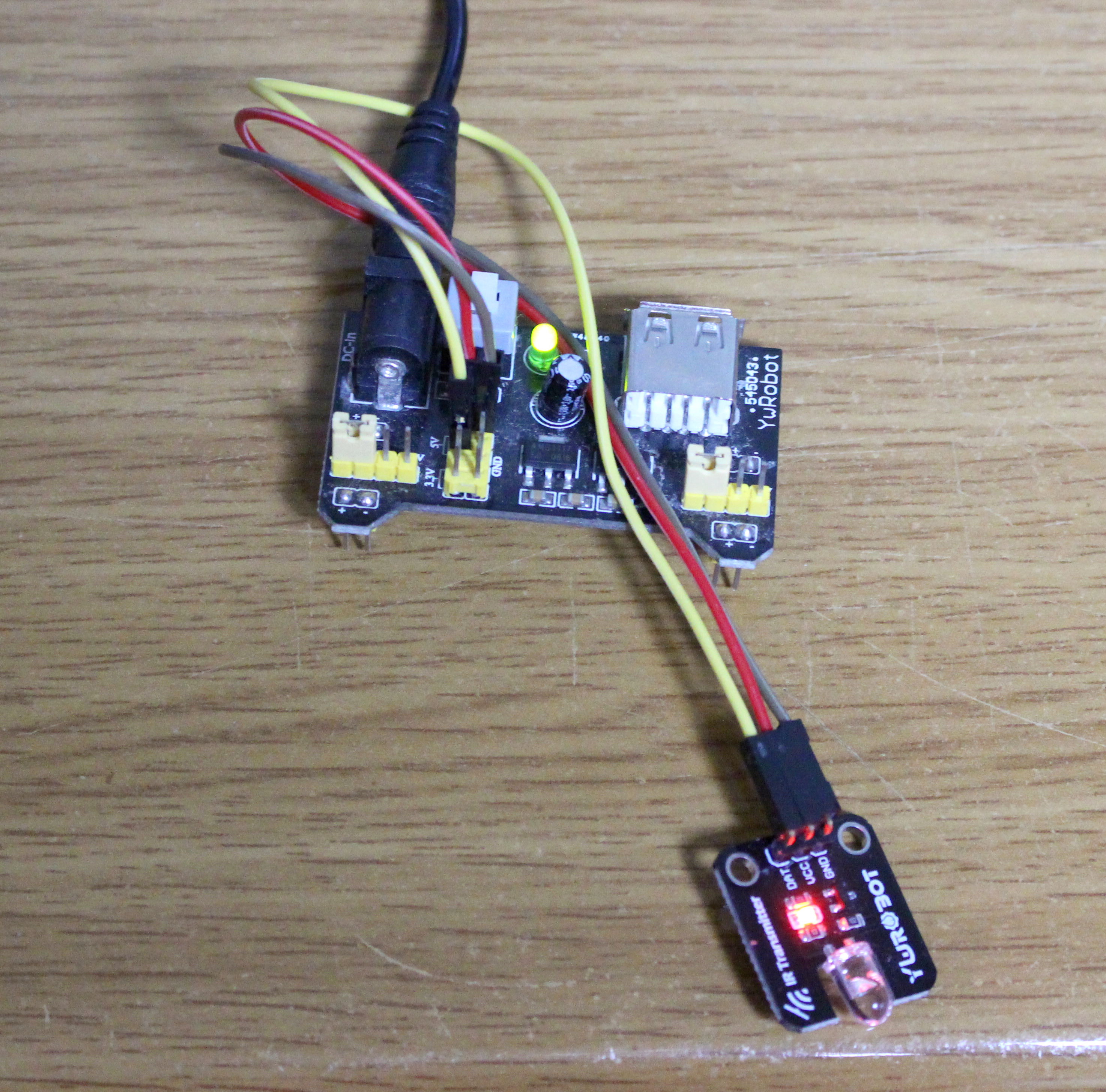 송신부는 전과 같이 적외선 LED를 연속으로 켰습니다. 수신부는 적외선의 세기에 따라 LED의 밝기가 달라지도록 했습니다.