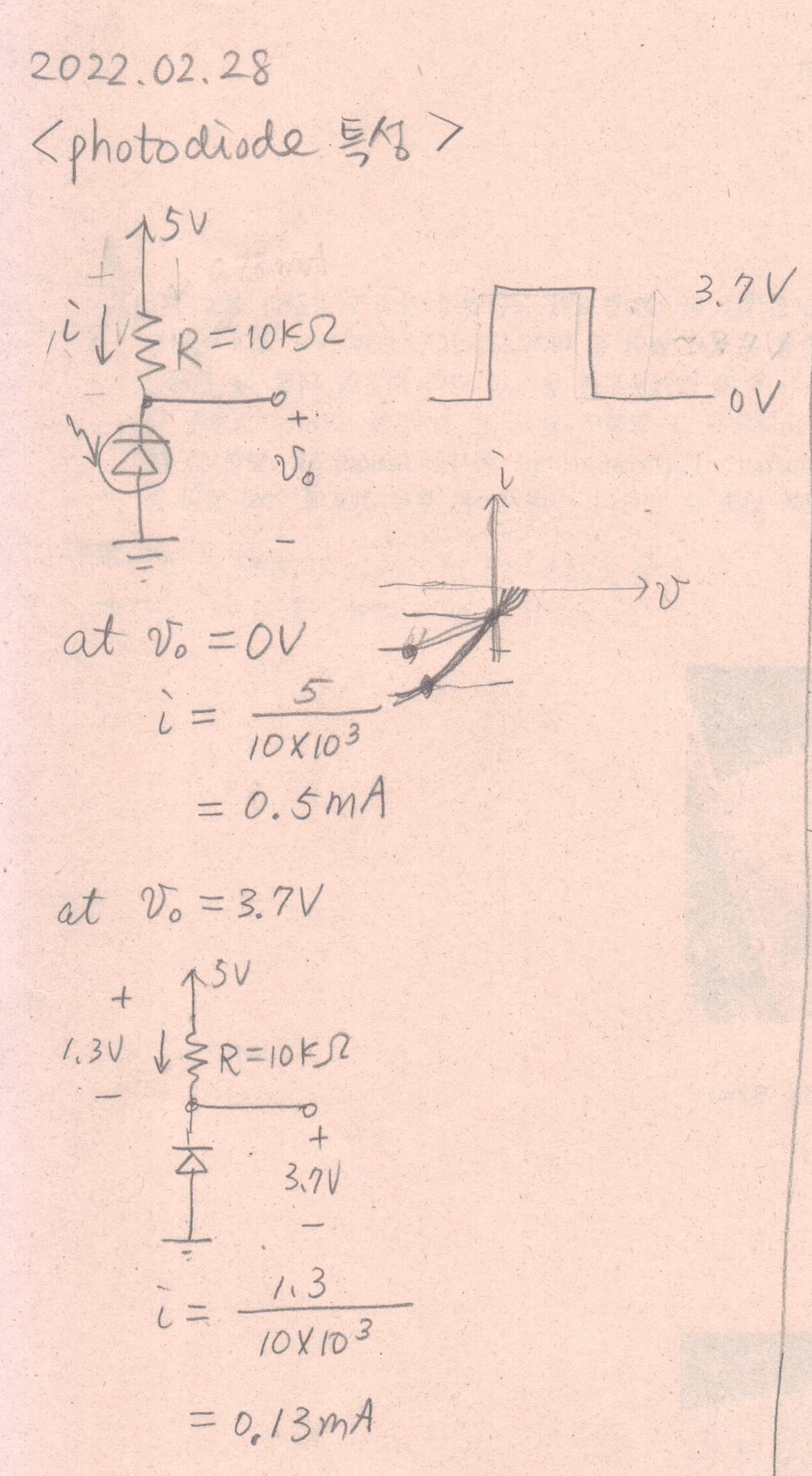 포토 다이오드의 특성을 알아보기 위해 10킬로옴의 저항을 직렬로 연결하고 역전압을 걸었습니다. 출력은 포토 다이오드 양단에서 취했습니다. 포토 다이오드에 적외선을 비추었을 때는 전류가 0.5mA가 흐르고 양단의 전압은 0V가 나왔습니다. 마치 단락된 것과 같았습니다. 적외선을 비추지 않았을 때는 전류가 0.13mA 흐르고 전압은 3.7V가 나왔습니다.