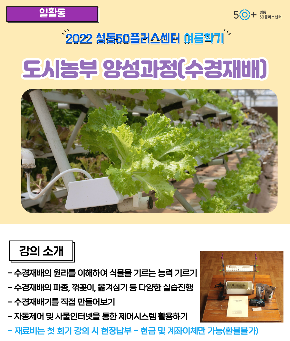 성동50플러스에서 진행하는 <도시농부 양성과정(수경재배)>(2기) 안내드립니다. 성동50플러스센터는 수경재배기를 갖추고 있기 때문에 수강 이후 수경재배와 관련한 동아리 활동을 하면 좋을 것 같습니다. 센터장님도 수경재배에 관심이 크십니다.^^