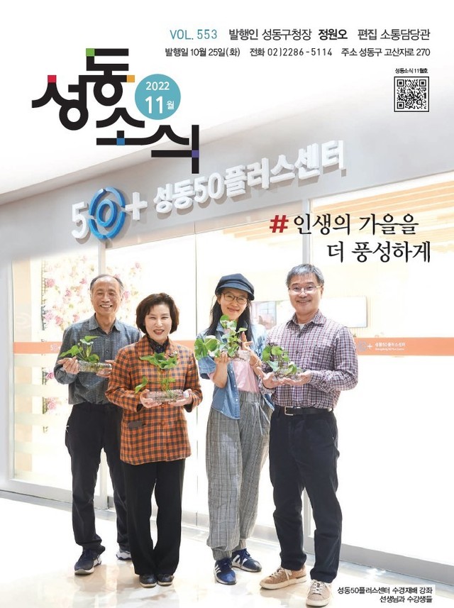 성동50플러스센터에서 수경재배 강의를 하게 되어 열심히 활동하다보니 성동구에서 발행하는 <성동소식>지의 표지에 나오게 되었습니다. 늘 배려해 주시는 센터장님, 강의 잘 할 수 있도록 챙겨주시는 직원 선생님들, 강의에 열심히 참여해 주시는 수강생님들께 감사드립니다.