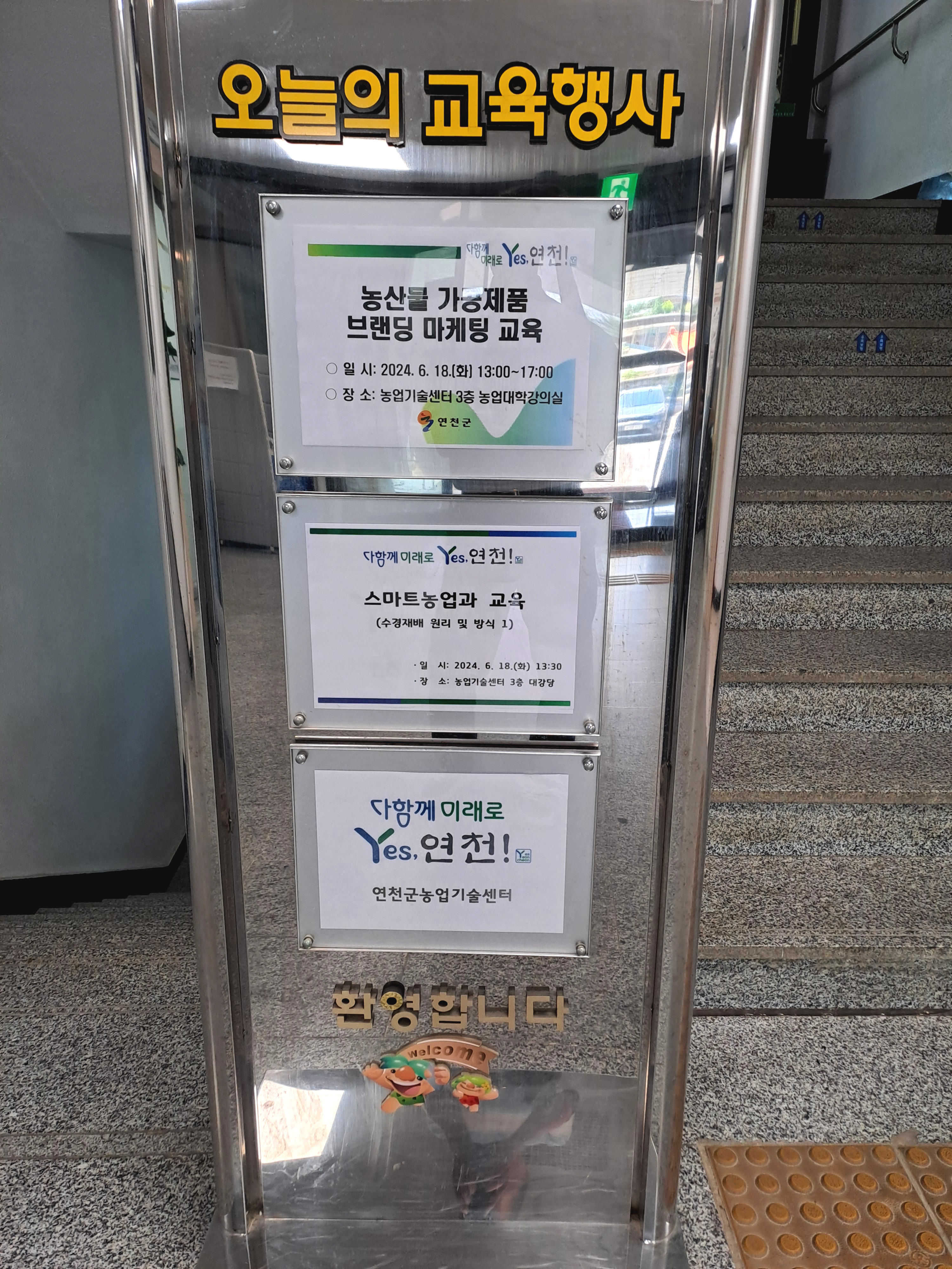 1층 현관문을 열고 들어가니 계단 앞에 오늘 있는 강의가 표시되어 있습니다.