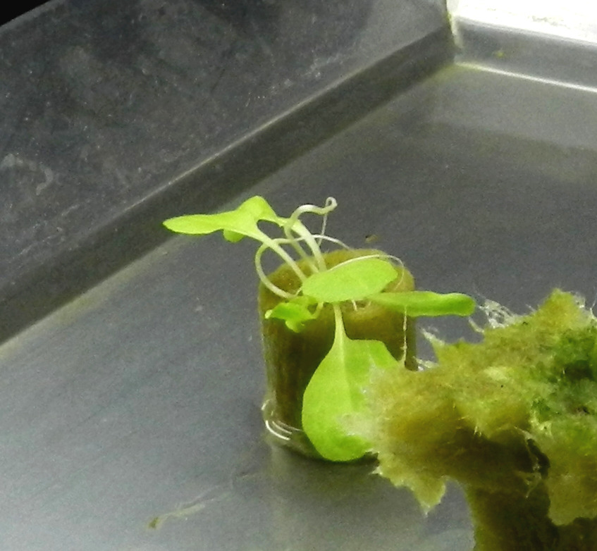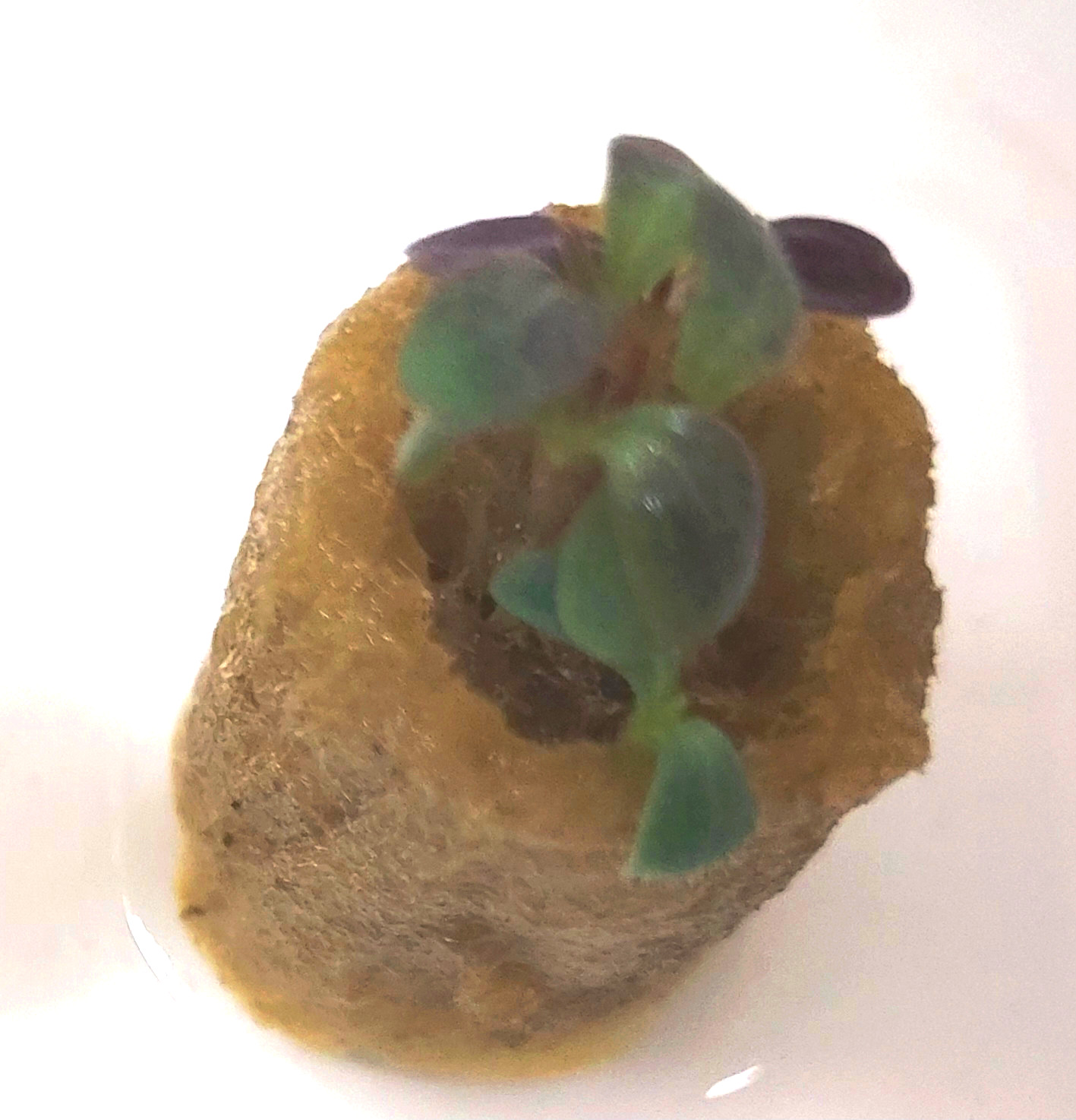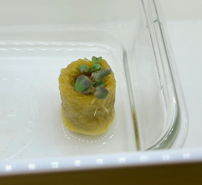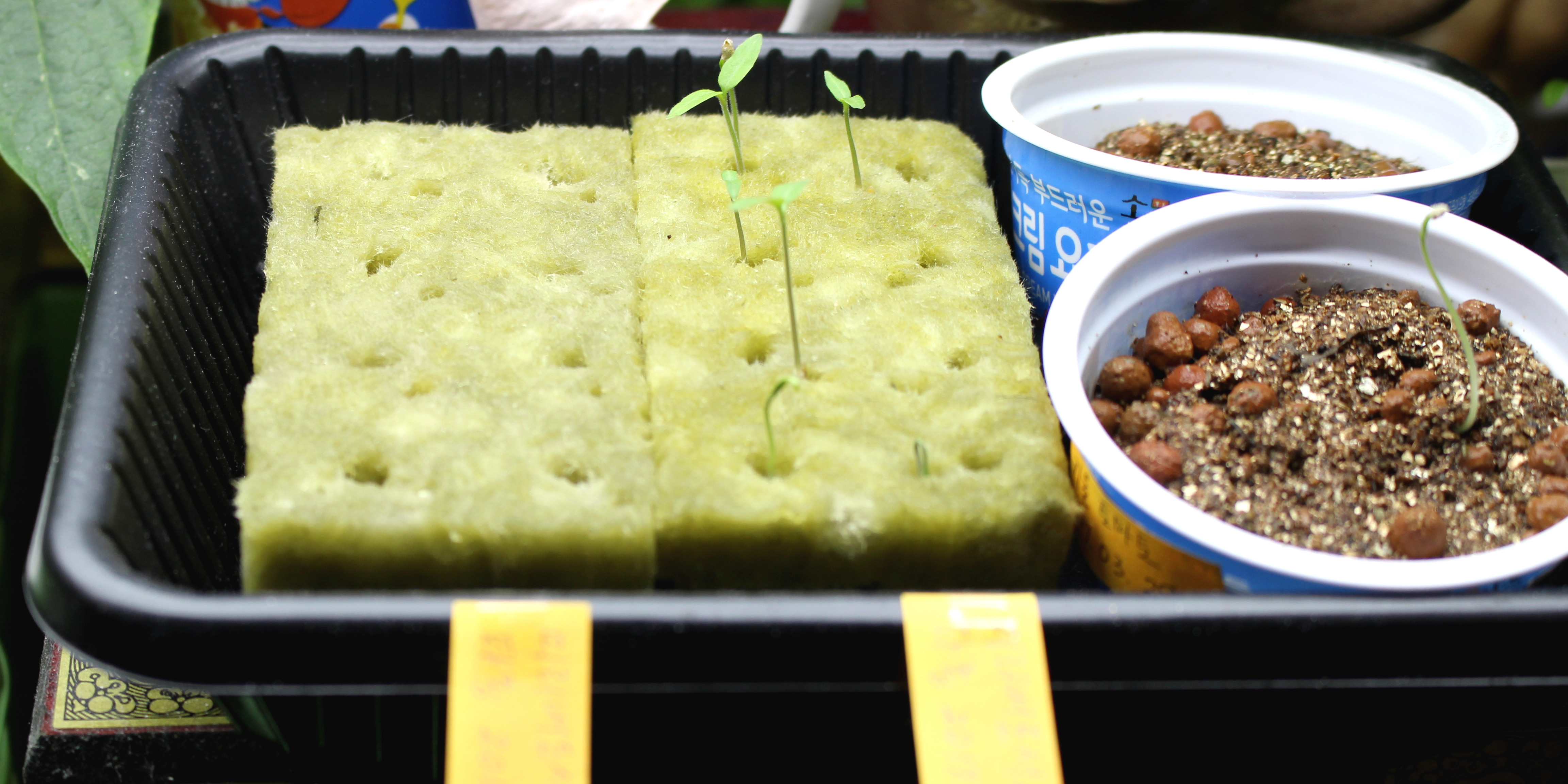 싹난 것의 줄기가 짧고 굵은 것을 보니 충분한 빛을 받은 것 같다. 두번째 사진의 새싹은 뿌리가 암면 위로 드러나 있는데, 씨앗을 너무 얕게 심어서 뿌리가 암면을 파고들지 못한 것으로 생각된다. 여름철이라 고온에 노출되었을 때는 줄기가 가늘고 헝클어지듯 자라는 수가 있다. 비슷해 보이지만 길게 자란 부분이 뿌리인 것과 줄기인 것이 다르다. 정리하면 다음과 같다.