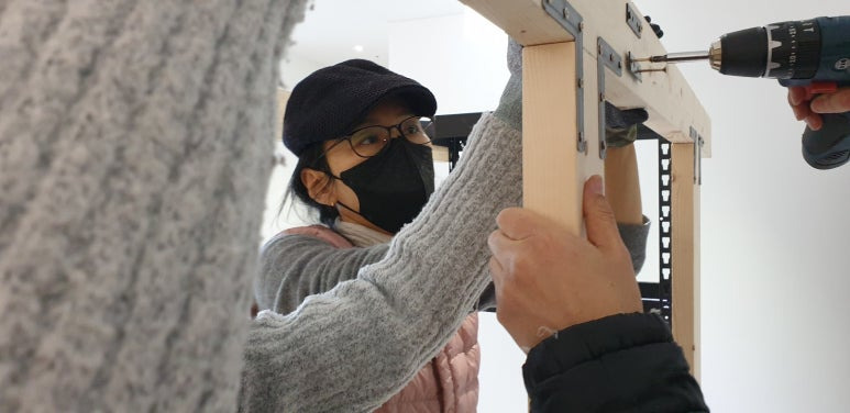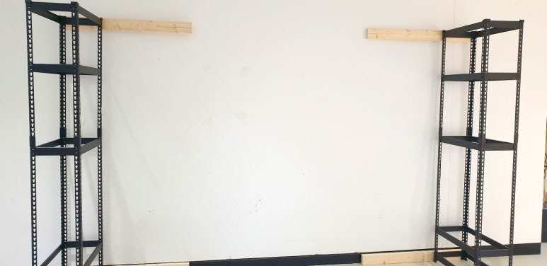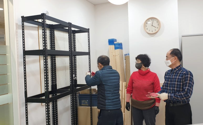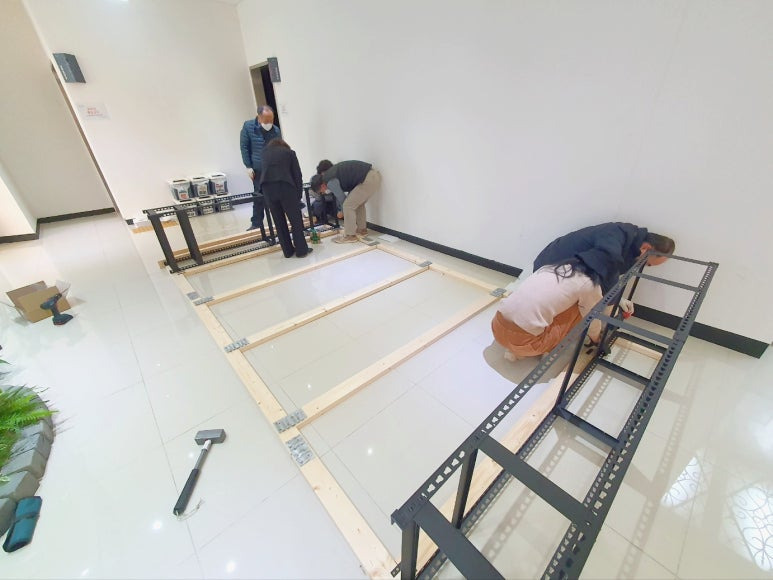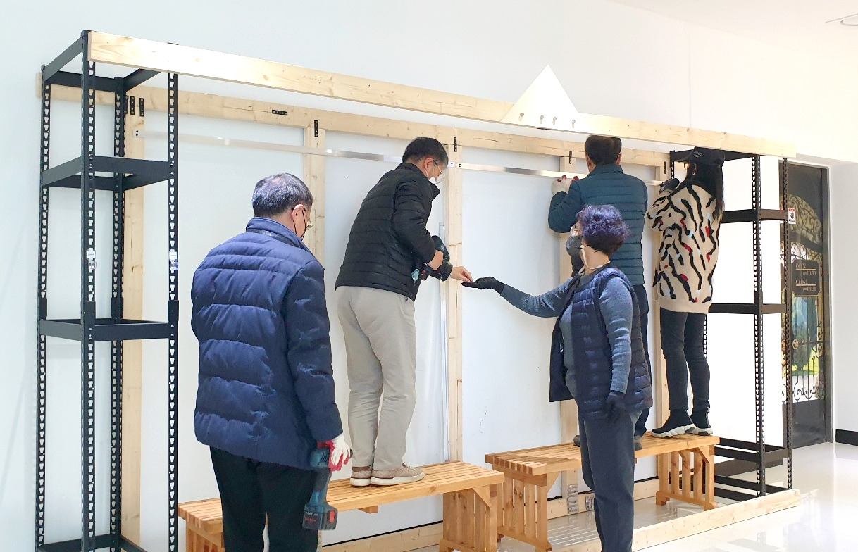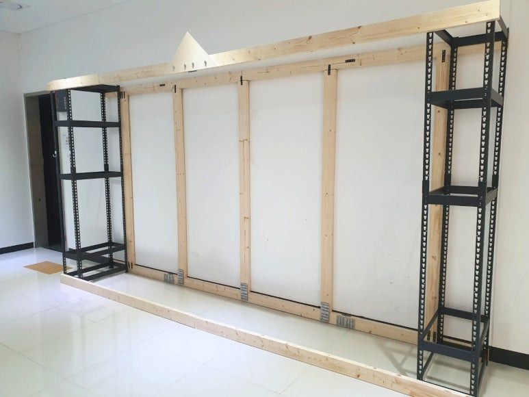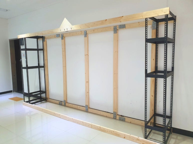 앵글선반을 그린월을 설치할 곳으로 옮기고, 보 일부를 연결했다. 앵글선반 프레임에 만들어져 있는 구멍을 이용하여 나사못으로 앵글선반 프레임과 목재를 고정했다.