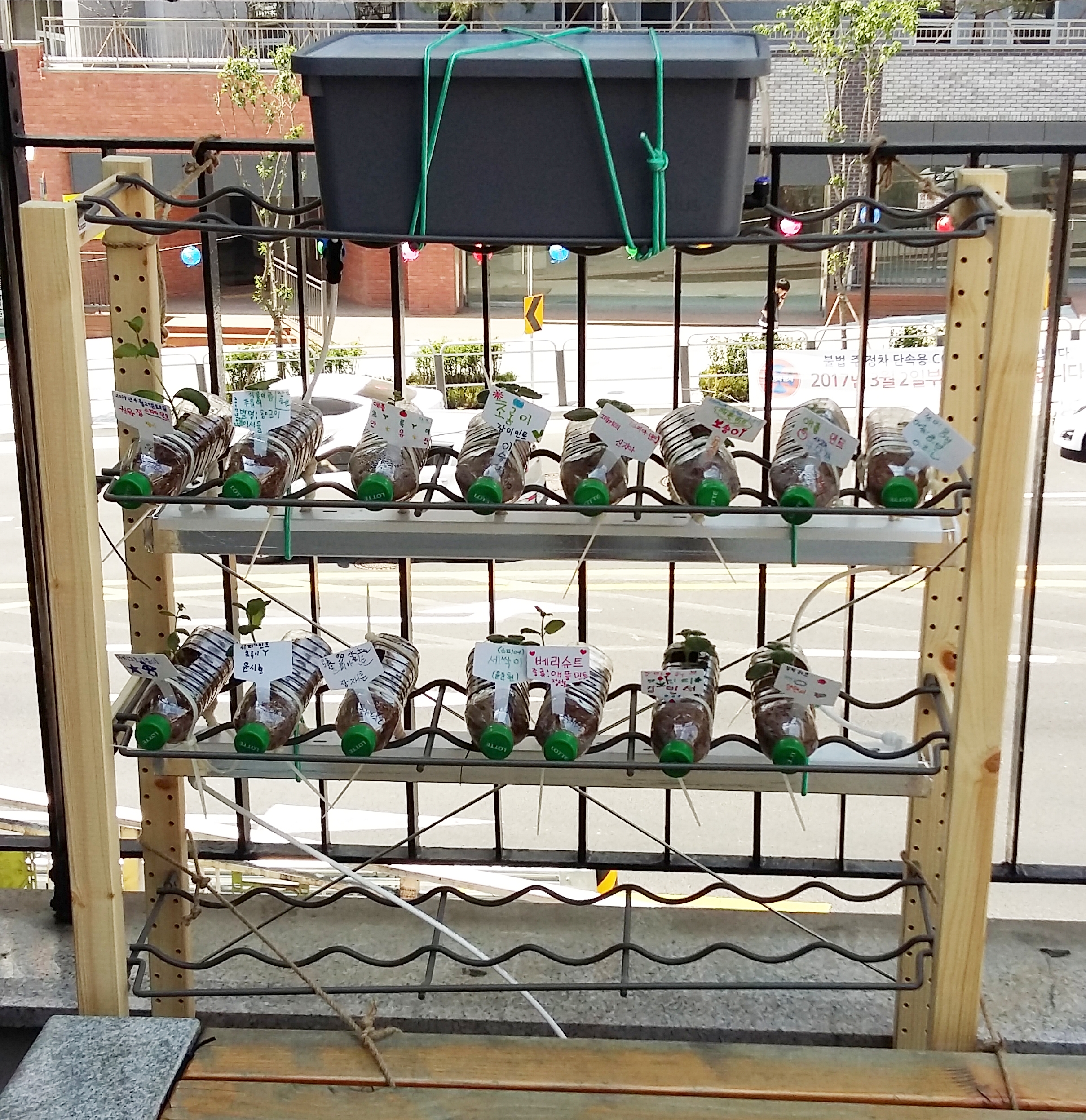 약 한 달이 지난 후의 모습이다. 페트명 내부에 물방울이 맺힌 것으로 보아 수분이 잘 공급되고 있음을 확인할 수 있다. 도서관 건물 때문에 하루에 햇빛이 비치는 시간이 짧은 것이 아쉬웠다.