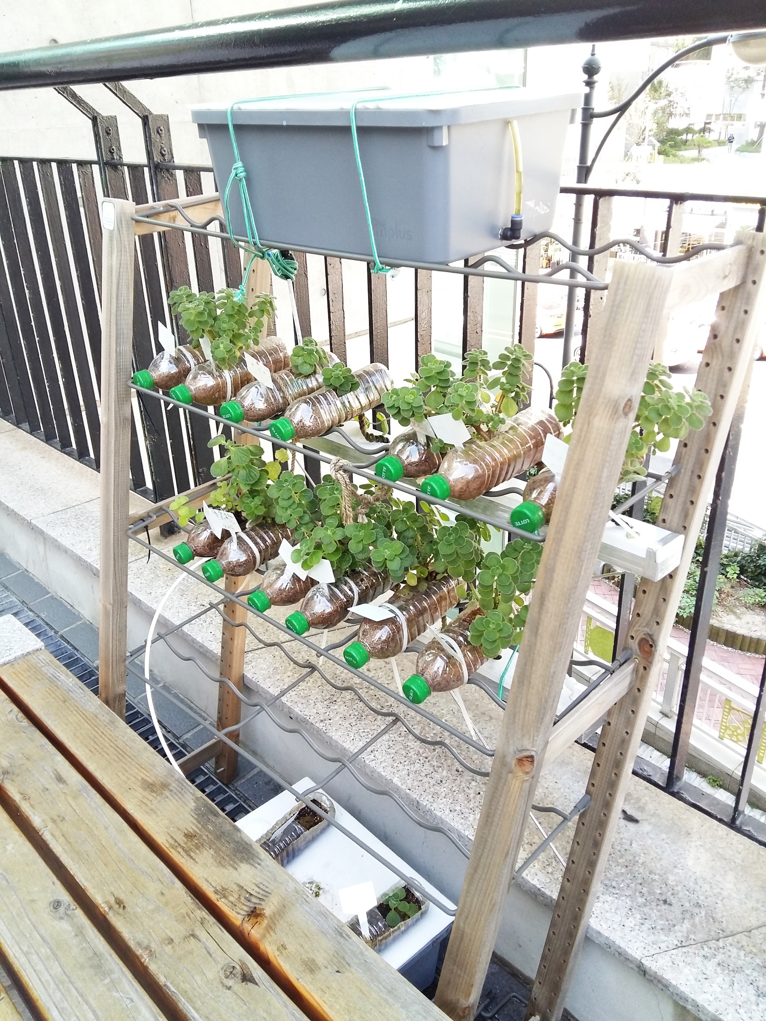재배기의 실물 모습이다. 양액수조는 15L 수납함을 이용했다. 원터치피팅, 호스, 밸브는 정수기용을 사용했다. 관은 랜덕트용 사각관을 사용했다. 사각관은 페트병 아래에 있어 눈에 잘 띄지 않는다. 식물은 장미허브, 애플민트, 스피아민트를 심었다.