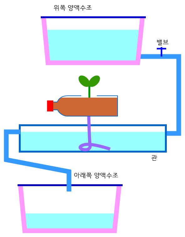 - 위쪽 양액수조에서 양액이 흘러나오는데, 식물이 사용하는 양액보다 조금만 더 나오도록 밸브를 조절해 놓는다. 위쪽 양액수조에서 나온 양액은 관으로 들어가는데, 대부분이 식물에 흡수되고 여분의 양액은 아래쪽 양액수조로 흘러들어가서 모이게 된다.