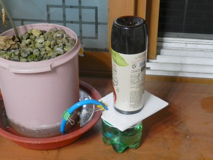 자동양액공급장치의 모습입니다. 재배박스와 양액공급장치의 높이차가 없어야 하기 때문에 스티로폼과 책으로 받쳐 놓았습니다.