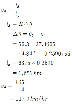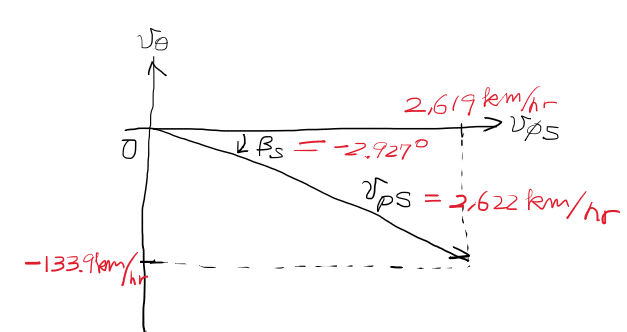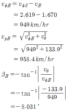 지구 밖에서 보면 비행기는 서북쪽을 향하고 있고, Vps 방향으로 밀려나는 것처럼 보인다. 경도 방향과 위도 방향을 합친 비행기의 속력은 다음과 같다. 위선(緯線; parallel of latitude)을 기준으로 한 각도도 구했다.