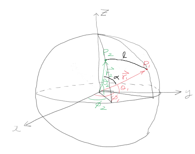 지구의 반지름이 일정하고, 지표상의 각 위치의 고도차가 없다고 가정했을 때 지표상의 두 점의 위치 벡터로부터 두 점 사이의 각을 구할 수 있다.