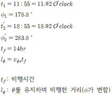 한편, 위도를 유지하며 비행한 거리는 다음과 같이 나타낼 수도 있다.